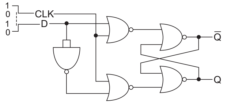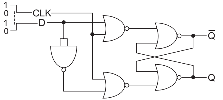 From the given circuit we conclude that Q goes to 1 at the CLK transition and goes to 0 when D goes to 1.