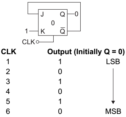 - In a JK flip-flop we have J = Q and K = 1 (shown in figure). Assuming the flip-flop was initially cleaned and then clocked for 6-pulses, the sequence at the Q will be—