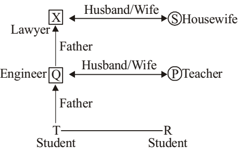 Direction: Directions : Read the following information carefully and answer the questions given below it. P, Q, R, S, T and X are members of a family. There are two married couples. Q is an engineer and the father of T. X is the grandfather of R and is a lawyer. S is the grandmother of T and is a housewife. There is one engineer one lawyer, one teacher, one housewife and two students in the family.