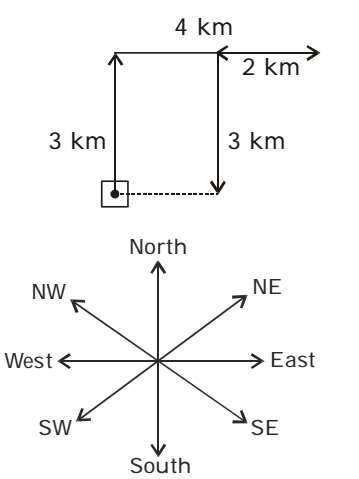 Raheja started from a point. He walked 3km to the North, then turned East and walked 4km, then turned West walked 2km and then turned West walked 3km and stopped. In which direction is Raheja from his starting point?