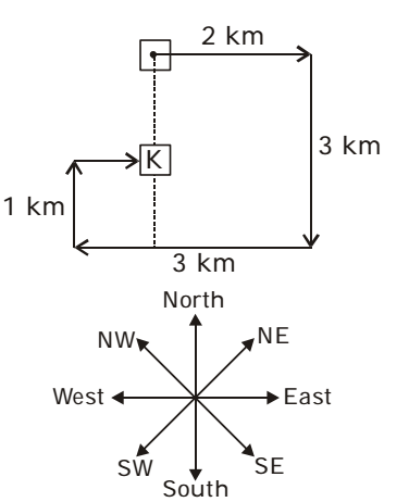 Rajan started from his house and went 2 km east, then he turned right and went 3 km, again turned right and went 3 km, again he turned right and covered 1 km and finally after turning right and going 1 km he reached point ‘K’. In which direction was Rajan walking when he reached?
