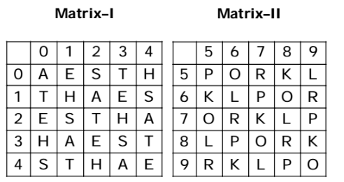 A word is represented by only one set of numbers as given in any one of the alternatives. The sets of numbers given in the alternatives are represented by two classes of alphabet as in two matrices given below. The columns and rows of Matrix I are numbered from 0 to 4 and that of Matrix II are numbered from 5 to 9. A letter from these matrices can be represented first by its row and next by its column, e.g., A can be represented by 12, 24, etc., and ‘R’ can be represented by 57, 76, etc. Similarly you have to identify the set for the word ‘ROSE’