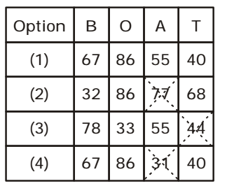 As shown in given figure , all the values for word BOAT are matched in only option ( 1 ) for every letter . So , the set for the word BOAT will be 67, 86, 55, 40 .From matrix , option ( 1 ) is correct .
