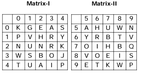 In this question, a word is represented by only one set of numbers as given in any one of the alternatives. The sets of numbers given in the alternatives are represented by two classes of alphabet as in two matrices given below. The columns and rows of Matrix I are numbered from 0 to 4 and that of Matrix II are numbered from 5 to 9. A letter from these matrices can be represented first by its row and next by its column, e.g., ‘A’ can be represented by 03, 55, etc., and ‘P’ can be represented by 10, 44, etc. Similarly you have to identify the set for the word ‘BOAT’.