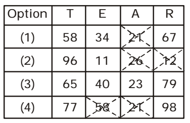 From given matrix it is clear that all the values for word TEAR are matched in only option ( 3 ) for every letter . So , the set for the word TEAR will be 65, 40, 23, 79 .From matrix , option ( 3 ) is correct .