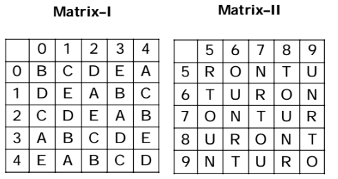 In this question, a word is represented by only one set of numbers as given in any one of the alternatives. The sets of numbers given in the alternatives are represented by two classes of alphabet as in two matrices given below. The columns and rows of Matrix–I are numbered from 0 to 4 and that of Matrix–II are numbered from 5 to 9. A letter from these matrices can be represented first by its row and next by its column, e.g., ‘B’ can be represented by 00,13, etc., and ‘O’ can be represented by 56, 68, etc. Similarly, you have to identify the set for the word ‘T E A R’.