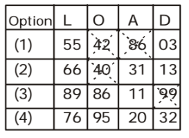 As shown in given figure , all the values for word LOAD are matched in only option ( 4 ) for every letter . So , the set for the word LOAD will be 76, 95, 20, 32 .From matrix , option ( 4 ) is correct .