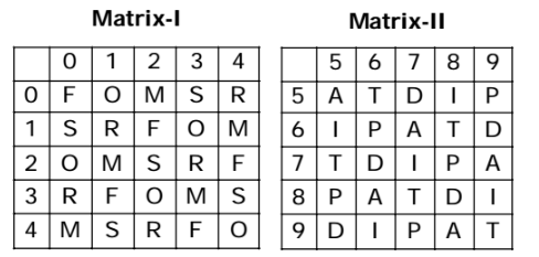 Direction: In each of the following questions a word is represented by only one set of numbers as given in any one of the alternatives. The sets of numbers given in the alternatives are represented by two classes of alphabets as in the 2 matrices given below. The columns and rows of Matrix I are numbered from 0 to 4. and that of Matrix II from 5 to 9. A letter form these matrices can be represented first by its row and then by the column number, e.g. ‘M’ can be represented by 14,21 etc. ‘O’ can be represented by 20, 32, etc. Similarly you have to identify the set for the word given in the question.