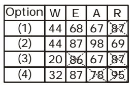 From given matrix it is clear that all the values for word WEAR are matched in only option ( 2 ) for every letter . So , the set for the word WEAR will be 44, 87, 98, 69 .From matrix , option ( 2 ) is correct answer.
