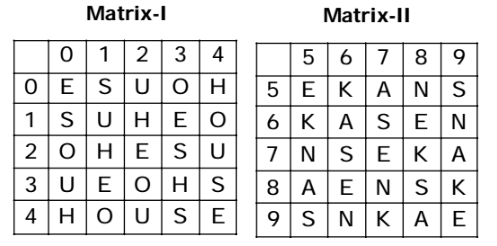 In this question, a word is represented by only one set of numbers as given in any one of the alternatives. The sets of numbers given in the alternatives are represented by two classes of alphabet as in two matrices given below. The columns and rows of Matrix I are numbered from 0 to 4 and that of Matrix II are numbered from 5 to 9. A letter from these matrices can be represented first by its row and next by its column, e.g., ‘O’ can be represented by 03,14, etc., and ‘K’ can be represented by 56, 65, etc. Similarly you have to identify