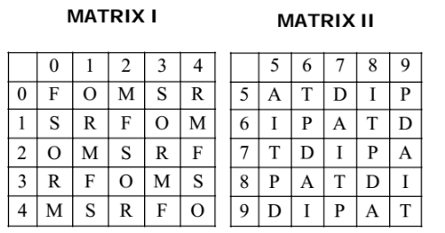 Direction: A word is represented by only one set of numbers as given in any one of the alternatives. The sets of numbers given in the alternatives are represented by two classes of alphabets as in the 2 matrices given below. The columns and rows of Matrix I are numbered from 0 to 4 and that of Matrix II from 5 to 9. A letter from these matrices can be represented first by its row and next column number, e.g. ‘M’ can be represented by 14, 21 etc. ‘O’ can be represented by 20, 32, etc. Similarly you have to identify the set for the word given in each question.