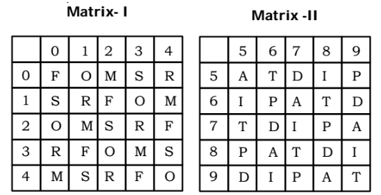 Direction: A word is represented by only one set of numbers as given in any one of the alternatives. The sets of numbers given in the alternatives are represented by two classes of alphabets as in the 2 matrices given below. The columns and rows of Matrix I are numbered from 0 to 4 and that of Matrix II from 5 to 9. A letter from these matrices can be represented first by its row and next by its column number. E.g. ‘M’ can be represented by 14,21 etc. ‘O’ can be represented by 20, 32, etc. Similarly you have to identify the set for the word given in each question.