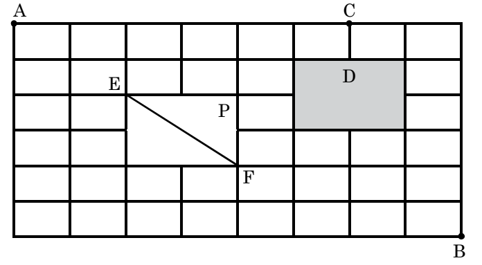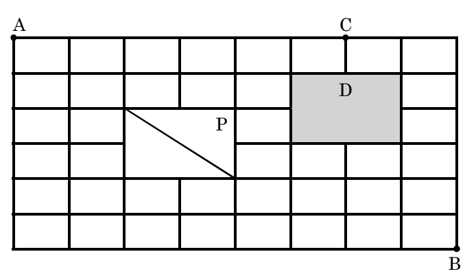 Direction: The figure below shows the plan of a town. The streets are at right angles to each other. A rectangular park (P) is situated inside the town with a diagonal road running through it. There is also a prohibited region (D) in the town