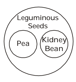 Indicate which figure will best represent the relationship amongst the three: Legumes Seeds, Peas, Kidney Beans