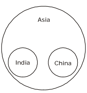 Choose from the given diagrams the one that illustrates the relationship among three classes. China, India, Asia