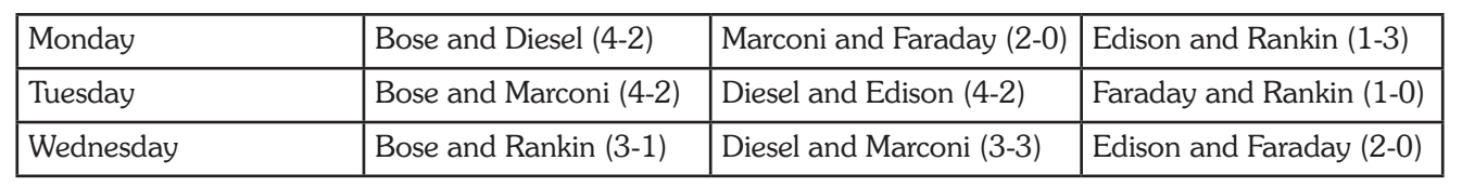 Number of points are as follows: Bose (3 + 3 + 3 = 9), Diesel (0 + 3 + 1 = 4), Edison (0 + 0 + 3 = 3), Faraday (0 + 3 + 0 = 3), Marconi (3 + 0 + 1 = 4), and Rankin (3 + 0 + 0 = 3)