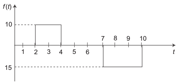 - f (t) = 10 u (t – 2) – 10 u (t – 4) – 15 u (t – 7) + 15 u (t – 10)