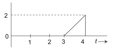The ramp falls from value of 2 at t = 3 to 0 at t = 4. The function (4 – t) goes from 1 to 0 in this interval and hence or 2 (t – 3) satisfies the given requirement. Thus, f (t) = 2 (t – 3) [u (t – 3) – u (t – 4)] The ramp equation is kr (t – T), where k is slope.