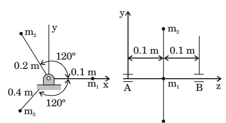 Three masses are connected to a rotating shaft supported on bearing A and B as shown in the figure. The system is in a space where the gravitational effect is absent. Neglect the mass of shaft and rods connecting the masses. For m1 = 10 kg, m2 = 5 kg and m3 = 2.5 kg and for a shaft angular speed of 1000 radian/s, the magnitude of the bearing reaction (in N) at location be is _________.