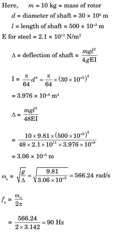 A flexible rotor-shaft system comprises of a 10 kg rotor disc placed in the middle of a massless shaft of diameter 30 mm and length 500 mm between bearings (shaft is being taken massiess as the equivalent mass of the shaft is included in the rotor mass) mounted at the ends. The bearings are assumed to simulate simply supported boundary conditions. The shaft is made of steel for which the value of E is 2.1 × 1011 Pa. What is the critical speed of rotation of the shaft?