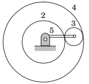 In the gear train shown gear 3 is carried on arm 5, Gear 3 meshes with gear 2 and gear 4. The number of teeth on gear 2, 3 and 4 are 60, 20, and 100, respectively. If gear 2 is fixed and gear 4 rotates with an angular velocity of 100 rpm in the counterclockwise direction, the angular speed of arm 5 (in rpm) is