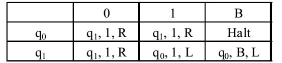 The table is interpreted as illustrated below. The entry (q1, 1, R) in row q0 and column 1 signifies that if M is in state q0 and reads 1 on the current tape square, then it writes 1 on the same tape square, moves its tape head one position to the right and transitions to state q1