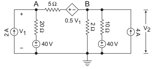 Applying KCL at node AV1 - 20 + V1 - 0.5V1 - V2 = 2 20 5