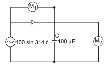 - In given fig., zero centre and ideal PMMC voltmeters M1 and M2 will read: