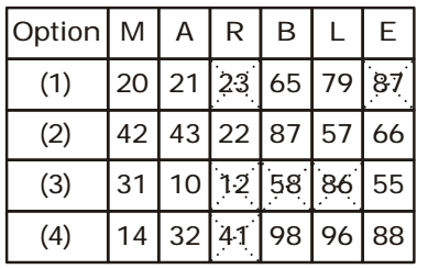 As shown in given figure , all the values for word MARBLE are matched in only option ( 2 ) .So , the set for the word MARBLE will be 42, 43, 22, 87, 57, 66 .From matrix , option ( 2 ) is correct .