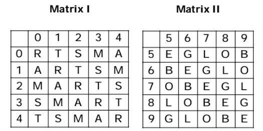 - A word is represented by only one set of numbers as given in any one of the alternatives. The sets of numbers given in the alternatives are represented by two classes of alphabets as in two matrices given below. The columns and rows of Matrix I are numbered from 0 to 4 and that of Matrix II are numbered from 5 to 9. A letter from these matrices can be represented first by its row and next by its column, e,g., ‘A’ can be represented by 04, 10, etc. and ‘B’ can be represented by 59, 65, etc. Identify the set for the word MARBLE.