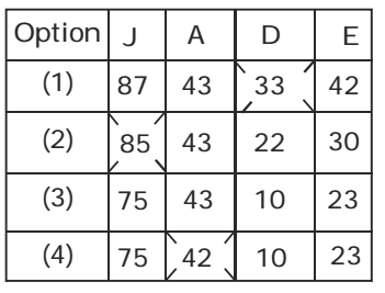 As shown in given figure , all the values of word JADE are matched in only option ( 3 ) for every letter . So , the set for the word JADE will be 75, 43, 10, 23 .From matrix , option ( 3 ) is correct .