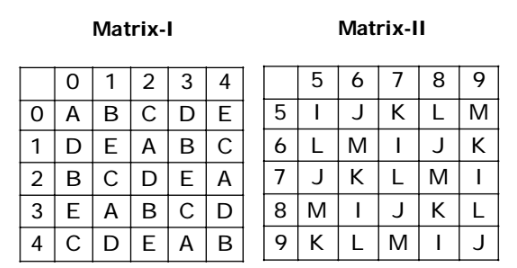 - A word is represented by only one set of numbers as given in any one of the alternatives. The sets of numbers given in the alternatives are represented by two classes of alphabets as in two matrices given below. The columns and rows of Matrix I are numbered from 0 to 4 and that of Matrix II are numbered from 5 to 9. A letter from these matrices can be represented first by its row and next by its column, e.g., C can be represented by 14, 21, etc., and K can be represented by 76, 88, etc. Similarly, you have to identify the set for the word JADE.