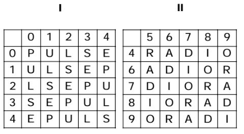 - A word is represented by only one set of numbers as given in any one of the alternatives. The sets of numbers given in the alternatives are represented by two classes of alphabets as in two matrices given below. The columns and rows of Matrix I are numbered from 0 to 4 and that of Matrix II are numbered from 5 to 9. A letter from these matrices can be represented first by its row and next by its column, e.g., ‘P’ can be represented by 00,14 etc and ‘A’ can be represented by 56,79 etc. Similarly, you have to identify the set for the word ROSE.