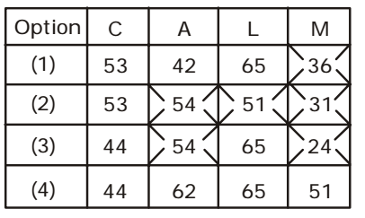As shown in given figure , all the values for word CALM are matched in only option ( 4 ) for every letter . So , the set for the word CALM will be 44, 62, 65, 51 .From matrix , option ( 4 ) is correct .