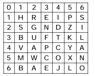 - A word is represented by only one set of numbers as given in any one of the alternatives. The sets of numbers given in the alternatives are represented by two classes of alphabets as in the matrix given below. The columns and rows of Matrix are numbered from 0 to 6. A letter from the matrix can be represented first by its row and next by its column, e,g., ‘A’ can be represented by 42, 62, etc. and ‘P’ can be represented by 15, 43, etc. Similarly, you have to identify the set for the word CALM.