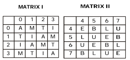 - A word is represented by only one set of numbers as given in any one of the alternatives. The sets of numbers given in the alternatives are represented by two classes of alphabets as in two matrices given below. The columns and rows of Matrix I are numbered from 0 to 3 and that of Matrix II are numbered from 4 to 7. A letter from these matrices can be represented first by its row and next by its column, e.g., ‘A’ can be represented by 00, 33, 21, etc. and ‘M’ can be represented by 22, 30, 13, etc. Identify the set for the word MEAL.