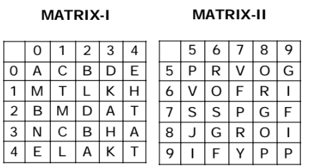 - A word is represented by only one set of numbers as given in any one of the alternatives. The sets of numbers given in the alternatives are represented by two classes of alphabets as in two matrices given below. The columns and rows of Matrix-I are numbered from 0 to 4 and that of Matrix-II are numbered from 5 to 9. A letter from these matrices can be represented first by its row and next by its column, e.g. ‘A’ can be represented by 00, 23, etc. and ‘P’ can be represented by 55, 69, etc. Similarly, you have to identify the set for the word given in the question. BEAST
