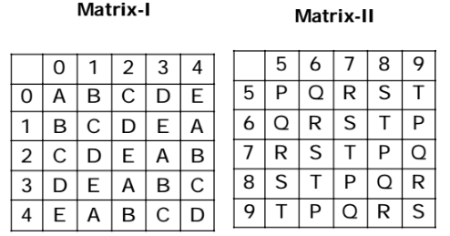 - A word is represented by only one set of numbers as given in any one of the alternatives. The sets of numbers given in the alternatives are represented by two classes of alphabets as in two matrices given below. The columns and rows of Matrix I are numbered from 0 to 4 and that of Matrix II are numbered from 5 to 9. A letter from these matrices can be represented first by its row and next by its column, e.g. ‘D’ can be represented by 03, 22, etc. and ‘R’ can be represented by 56, 68, etc. Similarly, you have to identify the set for the word CAST.