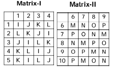 - A word is represented by only one set of numbers as given in any one of the alternatives. The sets of numbers given in the alternatives are represented by two classes of the alphabets as in two matrices given below. The columns and rows of Matrix I are numbered from 1 to 5 and that of Matrix II are numbered from 6 to 10. A letter from these matrices can be represented first by its row and next by its column, e.g., ‘L’ can be represented by 14, 33, 42 etc., and ‘M’ can be represented by 66, 79, 98 etc. Similarly, you have to identify the set for the word given below: PINK