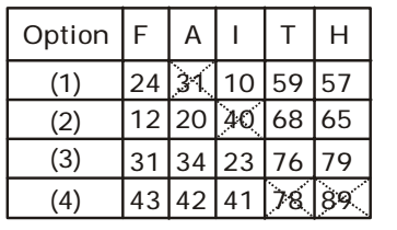 From given matrix it is clear that all the values for word FAITH are matched in only option ( 3 ) for every letter . So , the set for the word FAITH will be 31, 34, 23, 76, 79 .From matrix , option ( 3 ) is correct .