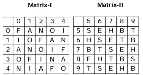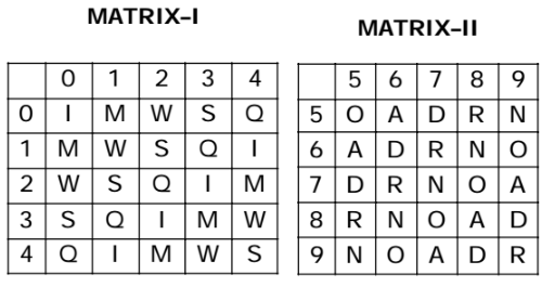 - A word is represented by only one set of numbers as given in any one of the alternatives. The sets of numbers given in the alternatives are represented by two classes of alphabets as in two matrices given below. The columns and rows of Matrix-I are numbered from 0 to 4 and that of Matrix-II are numbered from 5 to 9. A letter from these matrices can be represented first by its row and next by its column, e.g., A can be represented by 01, 20, 42 etc, and H can be represented by 65, 57, 98 etc. Similarly, you have to identify the set for the word given in the question.