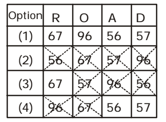 As shown in given figure , all the values for word ROAD are matched in only option ( 1 ) for every letter . So , the set for the word ROAD will be 67, 96, 56, 57 .From matrix , option ( 1 ) is correct .