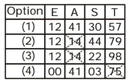 As shown in the given matrix ,we can see that all the values for word EAST are matched in only option ( 1 ) for every letter . So , the set for the word EAST will be 12, 41, 30, 57 .From matrix , option ( 1 ) is required answer.