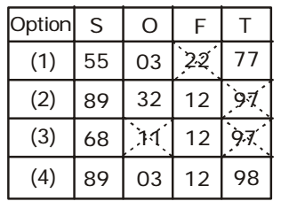 From given matrix it is clear that all the values for word SOFT are matched in only option ( 4 ) for every letter . So , the set for the word SOFT will be 89, 03, 12, 98 .From matrix , option ( 4 ) is correct .