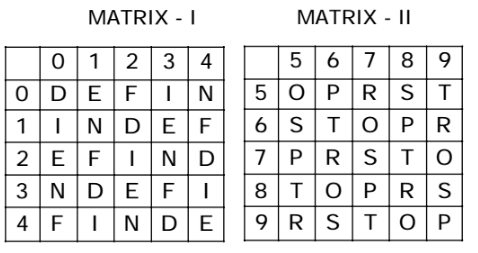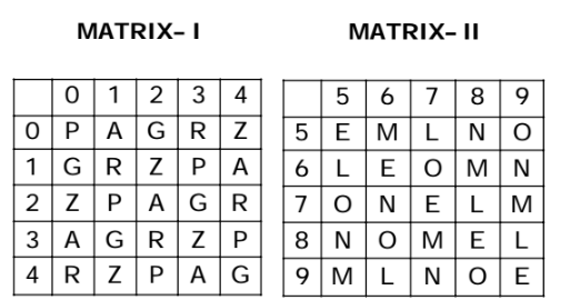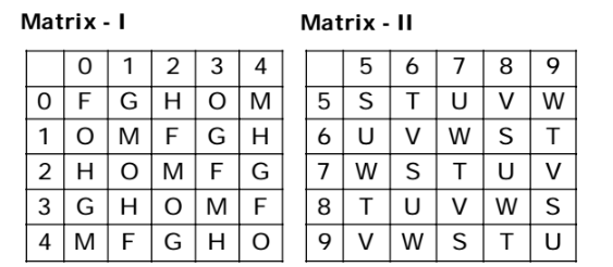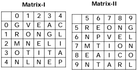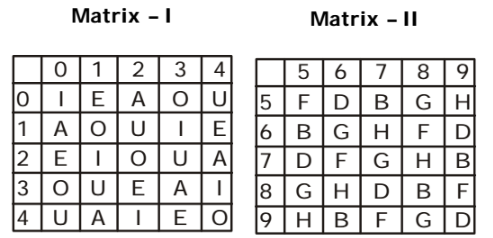- A word is represented by only one set of numbers as given in any one of the alternatives. The sets of numbers given in the alternatives are represented by two classes of alphabets as in two matrices given below. The columns and rows of Matrix I are numbered from 0 to 4 and that of Matrix II are numbered from 5 to 9. A letter from these matrices can be represented first by its row and next by its column, e.g., ‘I’ can be represented by 13, 21, etc. and ‘B’ can be represented by 57, 65, etc. Similarly, you have to identify the set for the word given in question.