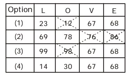 From given matrix it is clear that all the values for word LOVE are matched in only option ( 4 ) for every letter . So , the set for the word LOVE will be 14, 30, 67, 68 .From matrix , option ( 4 ) is correct .