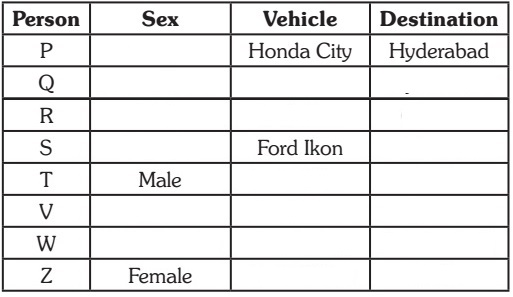 P, Q, R, S, T, V, W and Z are going to three destinations Delhi, Chennai and Hyderabad in three different vehicles – Honda City, Swift D’Zire and Ford Ikon. There are three females among them – one in each car. There are at least two persons in each car. R is not travelling with Q and W. T, a male is travelling with only Z and they are not going to Chennai. P is travelling in Honda City and is going to Hyderabad. S is the sister of P and is travelling by Ford Ikon. V and R are travelling together. W is not going to Chennai.