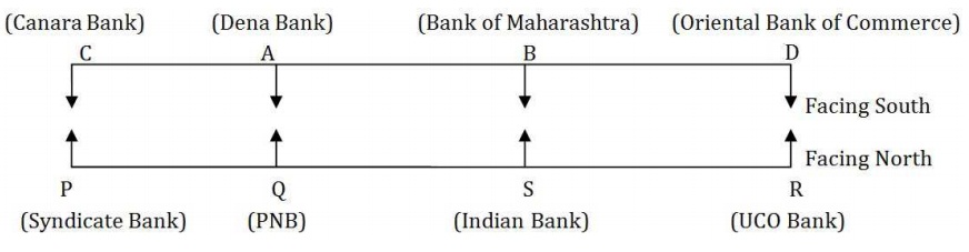 Eight persons from different banks, viz UCO Bank, Syndicate Bank, Canara Bank, PNB, Dena Bank, Oriental Bank of Commerce, Indian Bank and Bank of Maharashtra, are sitting in two parallel rows containing four people each, in such a way that there is an equal distance between adjacent persons. In row 1 A, B, C and D are seated and all of them are facing south. In row 2 P, Q, R and S are seated and all of them are facing north. Therefore, in the given seating arrangement each member seated in a row faces another member of the other row. (All the information given above does not necessarily represent the order of seating as in the final arrangement.)